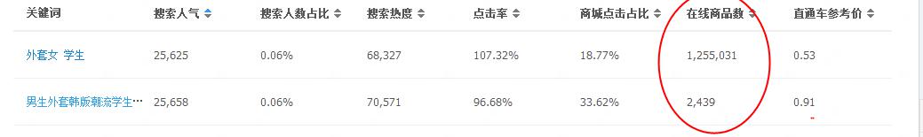 为什么?因为关键词越短,被包含在标题里的机会就越大,这一点不知道大家是否能够理解。比如说“外套女 学生”这个词覆盖的在线商品数就比较多,因为标题中能够加学生的产品有很多,而如果是“男生外套韩版潮流学生 百搭 bf”这样的关键词覆盖的在线商品数就会是少很多。