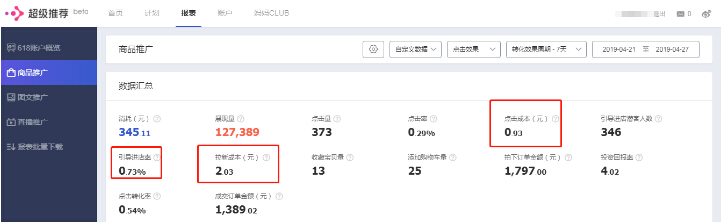 上图是刚建计划的数据,超级推荐也是一个周期性工具,前几天的拉新成本达到了4元,点击成本1.35元,引导进店率仅有0.45%。