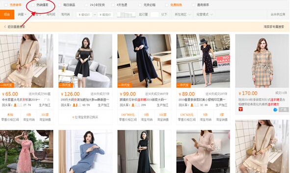 然后选择热卖商品,就可以看到近期销量比较好的款式。如果我们对产品的质量不放心,也可以在阿里巴巴中购买一两件样品看一下质量,确定之后再大量进货。