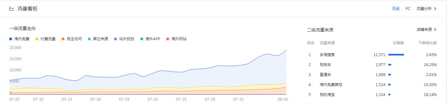 6.关注同行的流量结构分布,看自己缺少哪部分的流量,如有些类目整体钻展流量占比大,说明这个类目适合通过钻展去把店铺推动起来,如果你在这样的类目就应该跟上,让自己这部分流量跟得上同行。